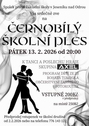 Spolek přátel ZŠ a MŠ v Jeseníku nad Odrou Vás srdečně zve na Školní ples. Letos se můžete těšit na novou kapelu, vystoupení dětí a bohatou tombolu. Těší se na Vás pořadatelé.