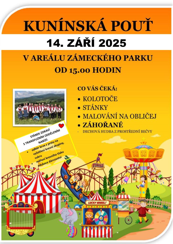Obec Kunín srdečně zve všechny občany i návštěvníky na tradiční Kunínskou pouť, která se uskuteční v neděli 14. září 2025. V areálu zámeckého parku bude připraven pestrý program pro celou rodinu – pouťové atrakce, stánkový prodej, stánek zdraví, malování na obličej a hudební doprovod.