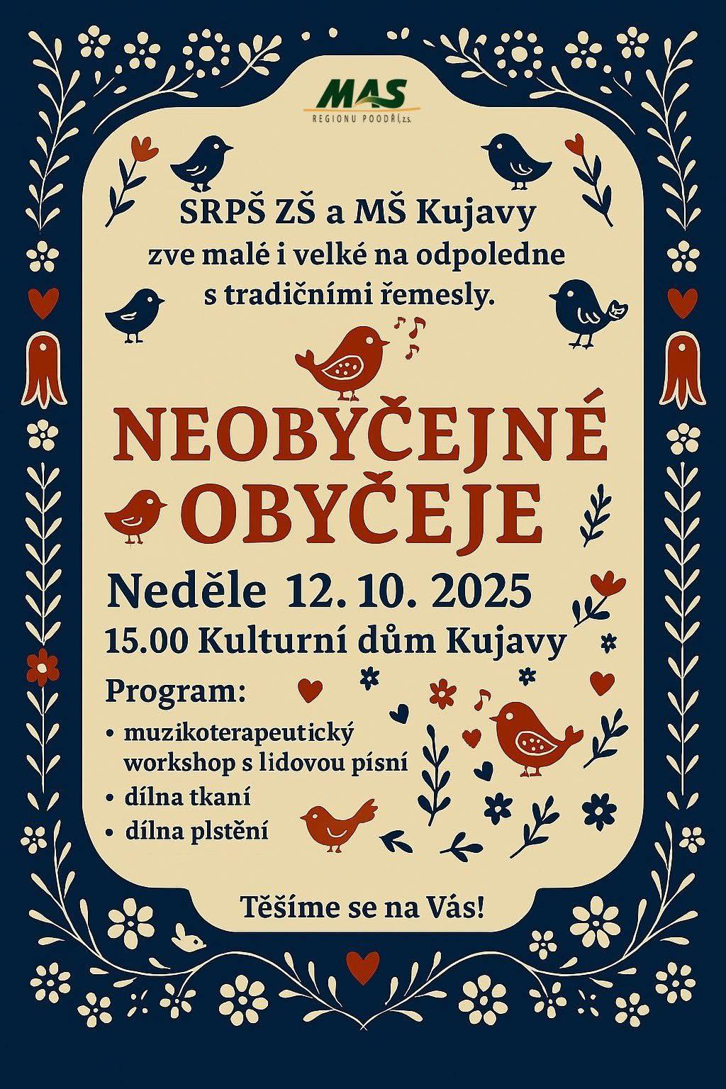 SRPŠ ZŠ a MŠ Kujavy zvou malé i velké v neděli 12.10.2025 od 15:00 hodin do Kulturního domu v Kujavách na odpoledne s tradičními řemesly.