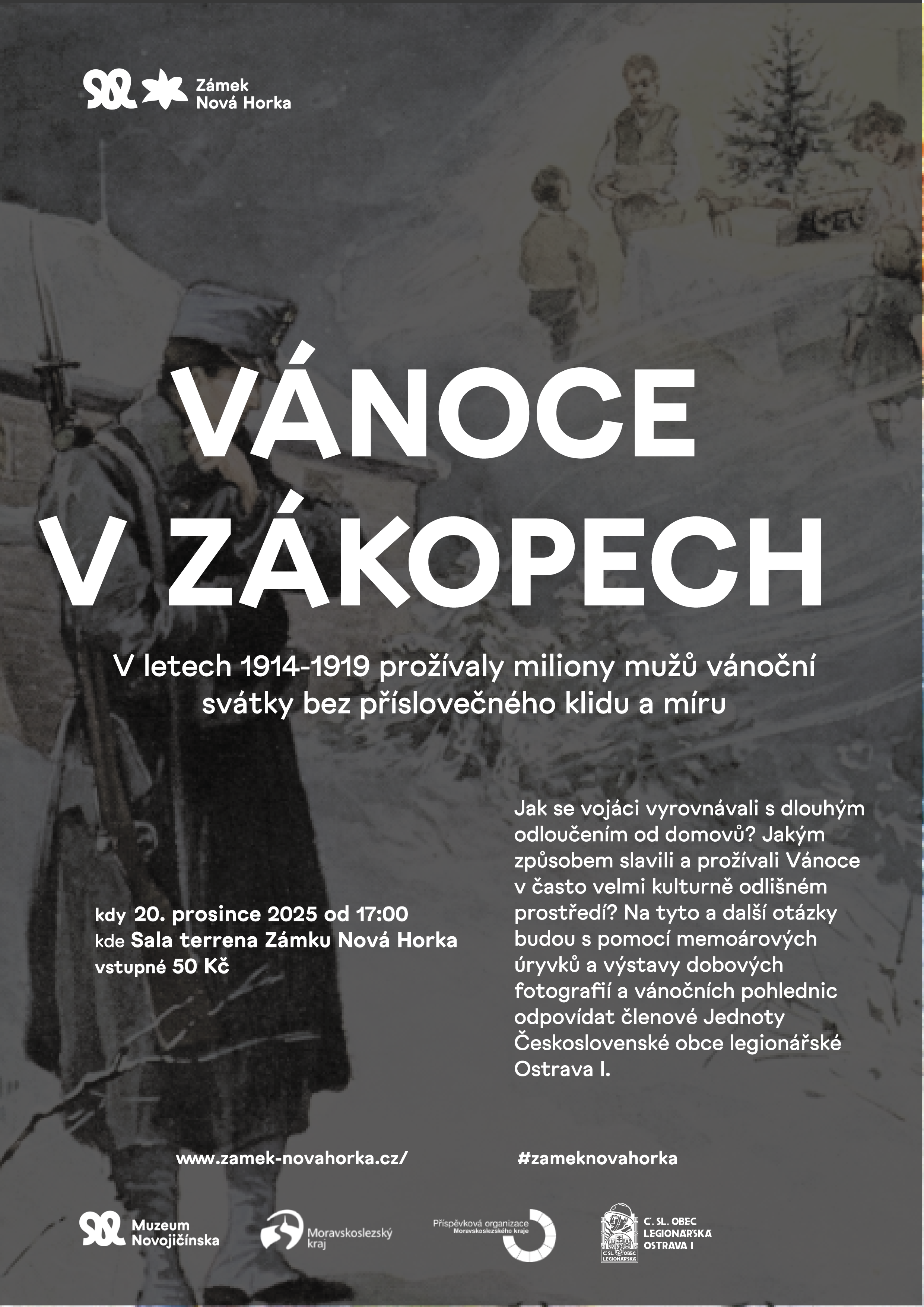 Na otázky, jak prožívaly miliony mužů v letech 1914 - 1919 vánoční svátky budou odpovídat s pomocí memoárových úryvků a výstavy dobových fotografií členové Jednoty Československé obce legionářské Ostrava I.v sobotu 20.prosince 2025 od 17:00 hodin v Zámku Nová Horka.