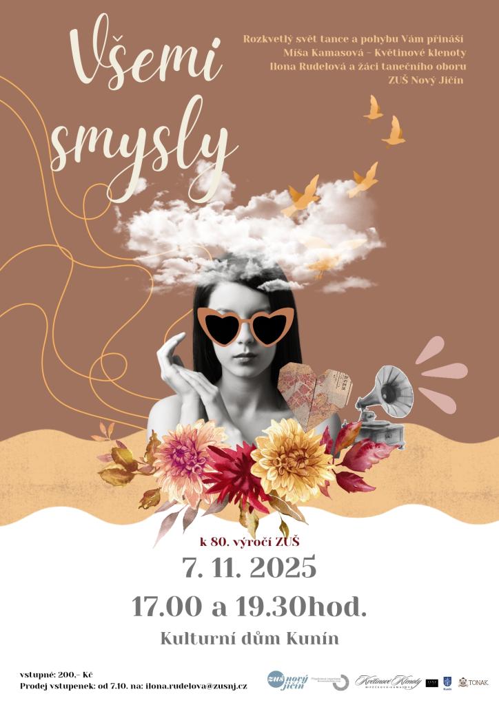 Pozvánka u příležitosti 80. výročí ZUŠ Nový Jičín Rozkvetlý svět tance a pohybu, který Vám přináší Míša Kamasová – Květinové klenoty Ilona Rudelová a žáci tanečního oboru ZUŠ Nový Jičín KDE: Kulturní dům v Kuníně KDY: 7. 11. 2025 v 17:00 a 19:30